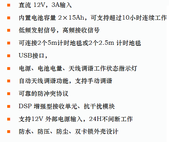 直流12V, 3A输入 内置电池容量2X 15Ah,可支持超过10小时连续工作 低频发射信号,高频接收信号 可连接2个5m计时地毯或2个2.5m计时地毯 USB接口, 电源、电池电量、天线调谐工作状态指示灯